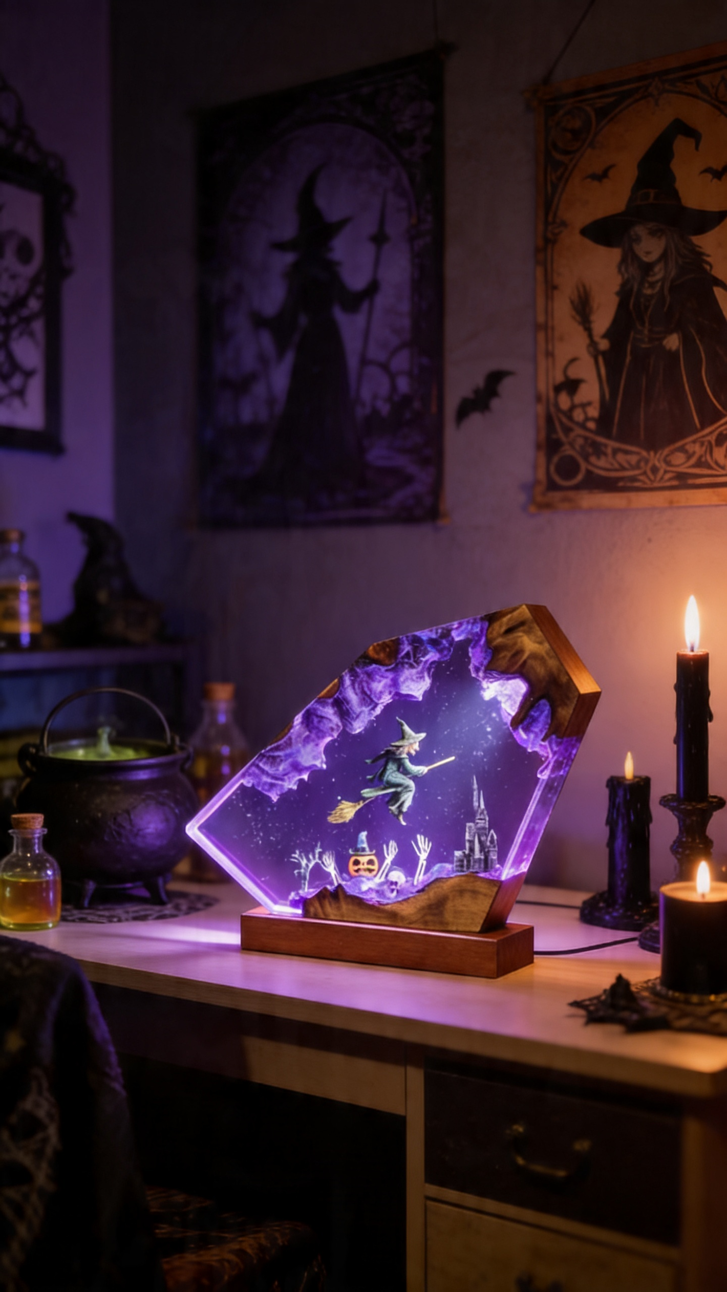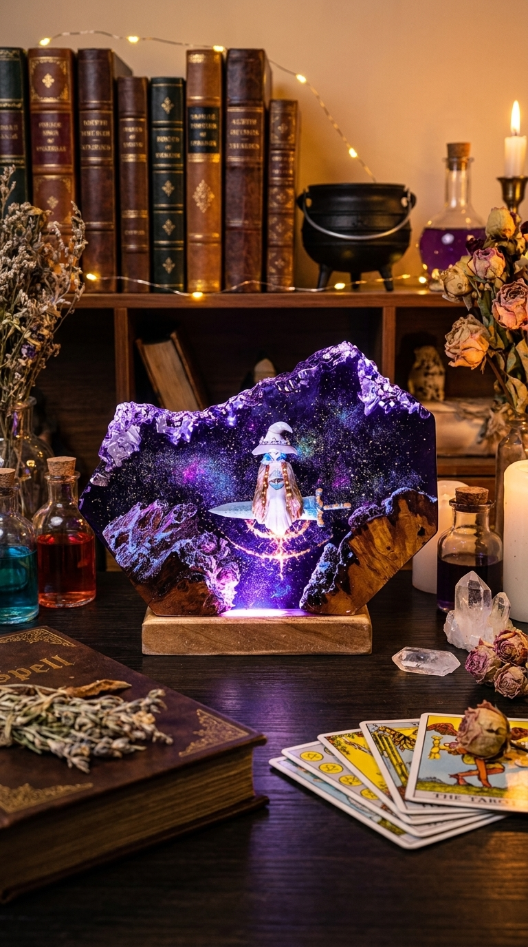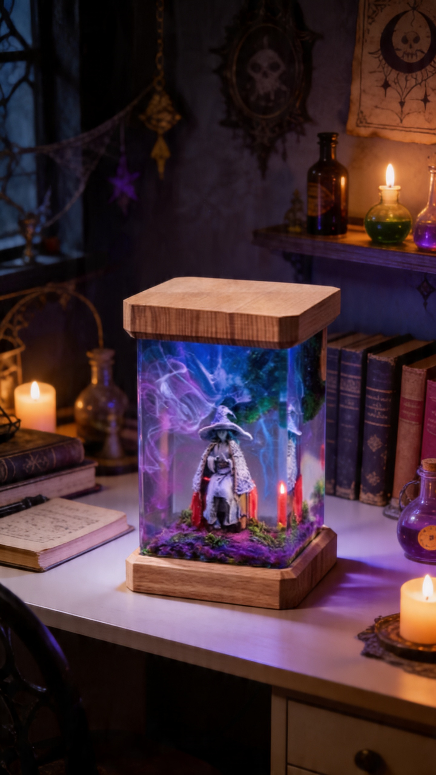 hand-painted resin figures, sealed in layered resin and set on a live-edge wood base. each one holds its own little world — a witch, a grove, a galaxy.